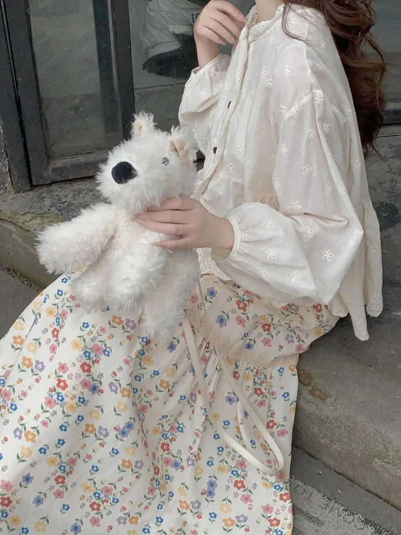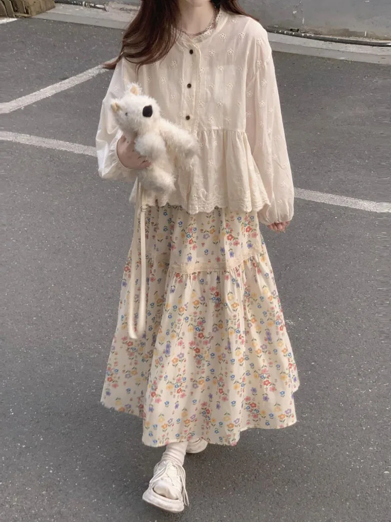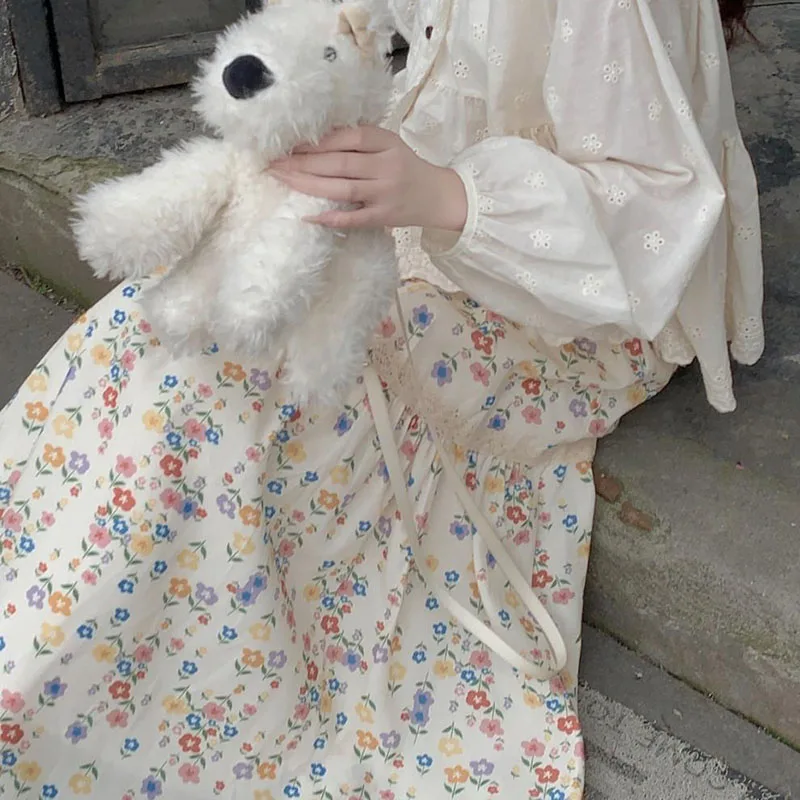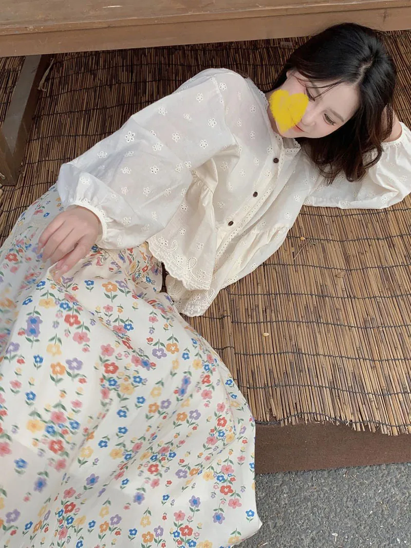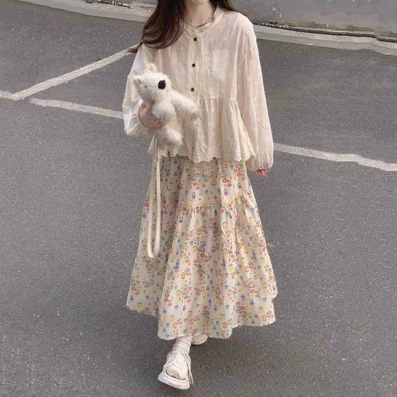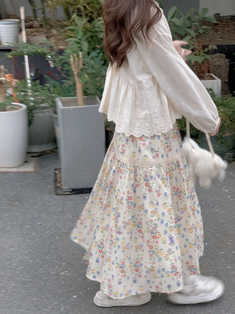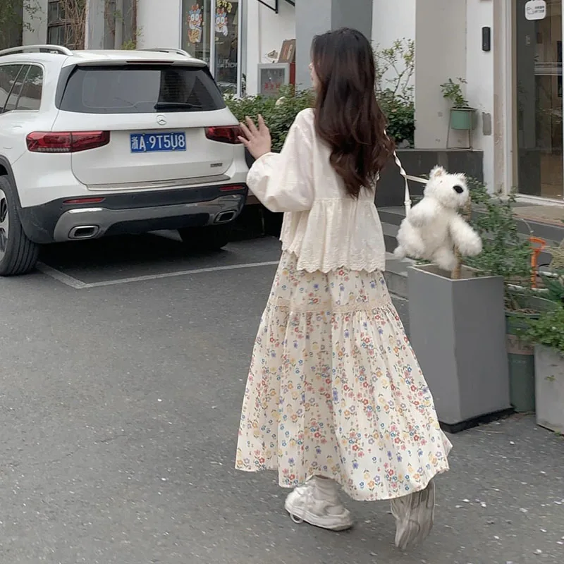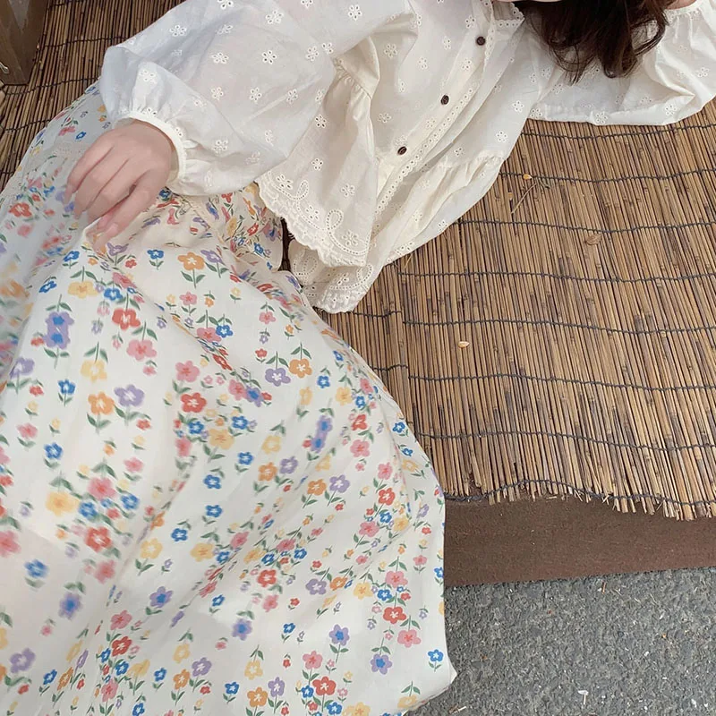 تنورات طويلة مطوي بطبعة أزهار عتيقة ، تنورات كورية غير رسمية للنساء ، ملابس الشارع ، تنورات متوسطة الطول مرنة عالية الخصر