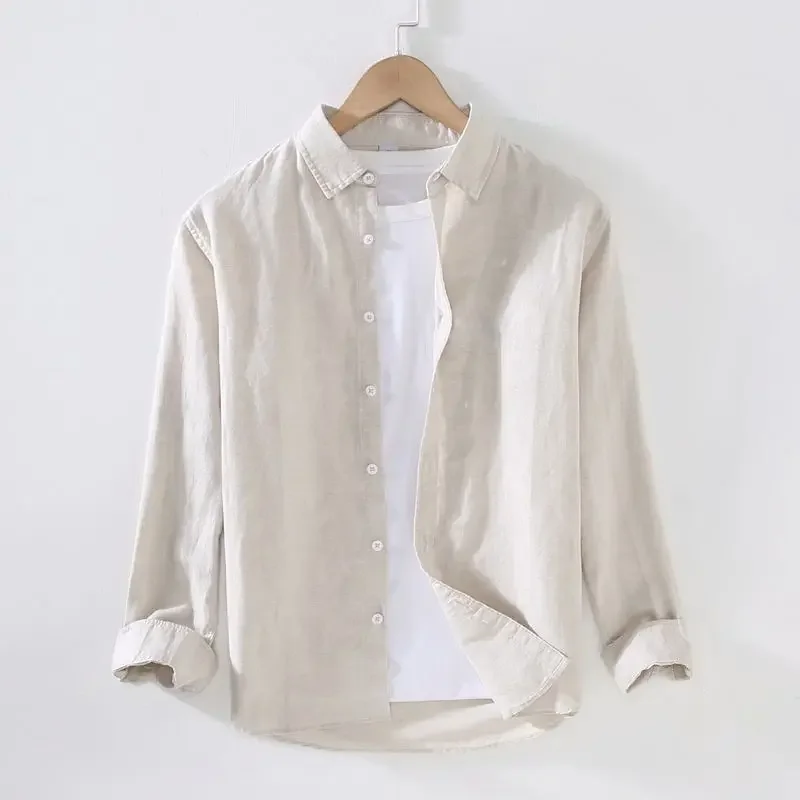 قميص كتان رفيع كاجوال للرجال بأكمام طويلة وفضفاض من القطن والكتان وياقة مربعة عصرية للربيع والصيف باللون الأبيض الداخلي