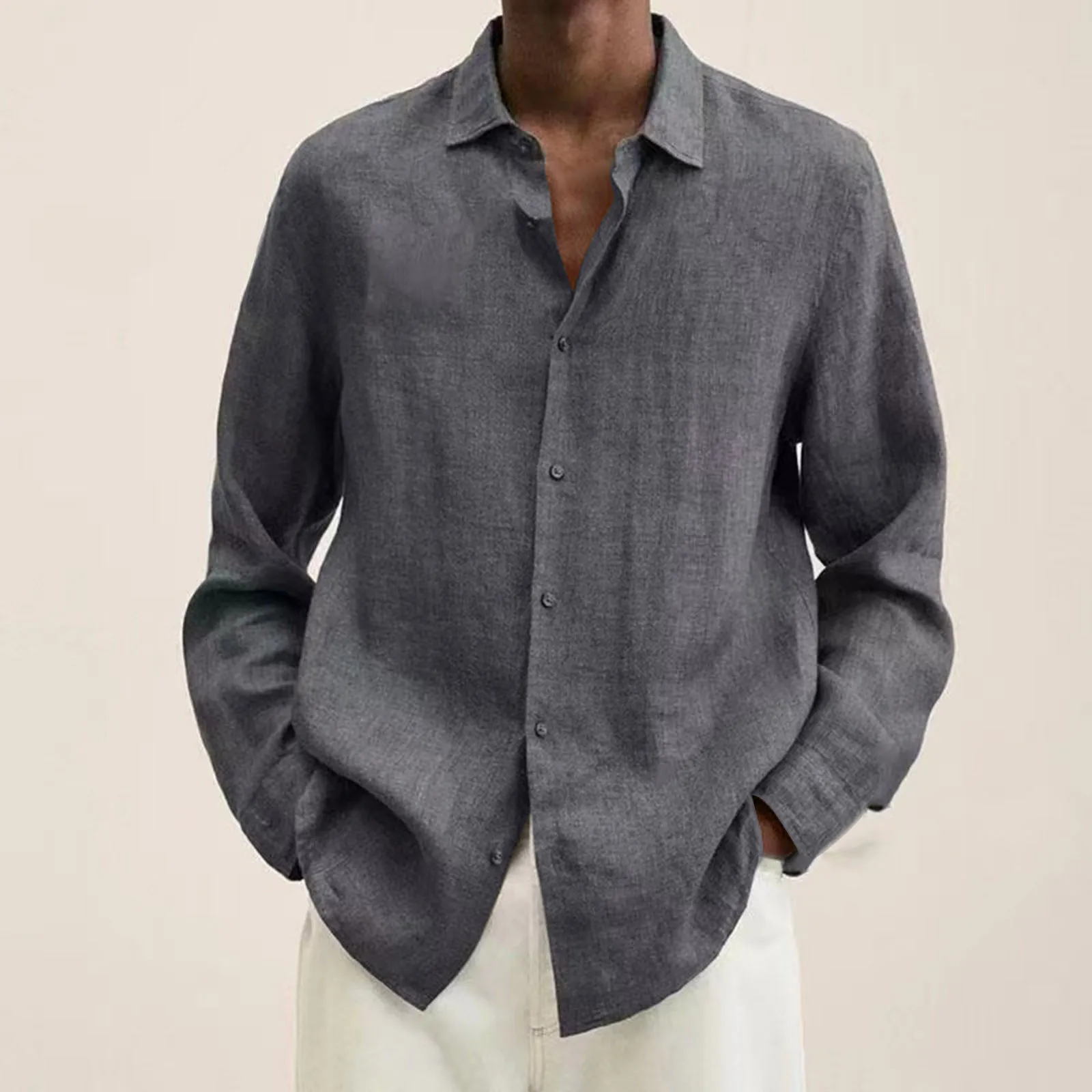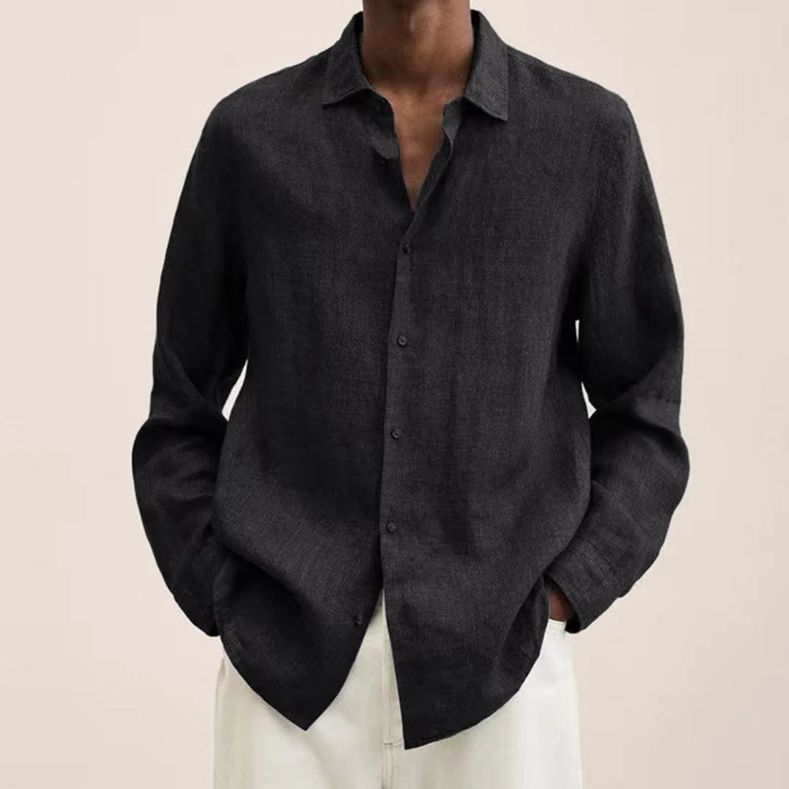 قمصان كاجوال من الكتان القطني للرجال للربيع والصيف بلون سادة قمصان بأكمام طويلة قمصان فضفاضة